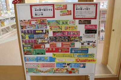 図書室前に、新しく図書室に入った本の帯が展示されていました。