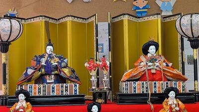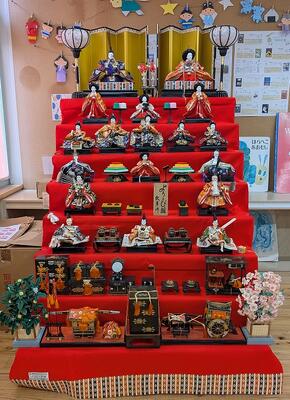 図書ボランティアの皆さんに、今年もひな人形を飾り付けていただきました。