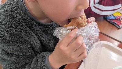 給食センターでは、パンを油であげ、きなこをまぶし、袋に入れるため、
