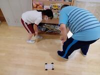 そして、担任の先生と、車が走った距離を巻き尺で調べていました。