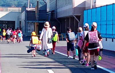 今朝は集団登校訓練を行いました。地区ごとの集合場所から、