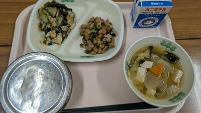 今日の給食メニューは、年に何度か登場する”スタミナ納豆”!