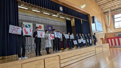 6年生は体育館のひな壇に座り、学年ごとに体育館を訪れて発表し、