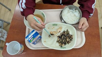 3学期の給食1日目のメニューは、麦ごはん、豚汁、ヒジキ煮、焼き魚の和食でした。