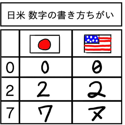 斜め線付の「7」の他にも、日本と外国では、数字の書き方に違いがあるようです。